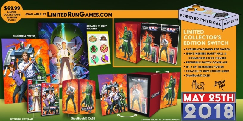 The collector’s edition comes with the reversible cover and instruction booklet, but also 3.75″ posable Marty Hall and Commander Hood action figures, a music cassette tape, scratch ‘n sniff sticker sheet, double-sided 18″ x 24″ poster featuring art by Paul Mann and Eric Huang, and an official Nintendo Switch steelbook case. Only 2,500 collector’s editions will be produced.