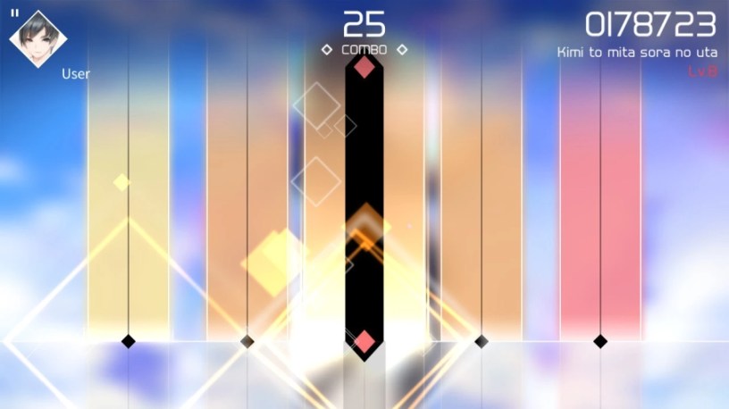 Players are required to tap, hold, slide, or swipe on-screen notes as they drop from the top of the screen onto the lines at the bottom. New entries in the storyline diary can be unlocked, adding new story content, locations, and artwork.