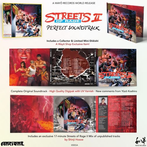 The Streets of Rage 2 CD also comes on a picture disc and includes a 17-minute mix by composer Shinji Hosoe (of Dragon Spirit, Giga Wrecker, and Ridge Racer). The album is housed in a three-panel digipak and first pre-orders will come with limited mini-shikishi art. Shipping is expected towards the end of May to June.