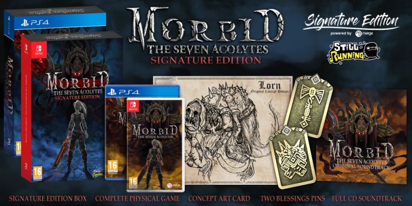 Morbid: The Seven Acolytes – Signature Edition comes with a copy of the game, two limited-edition enamel pins with depictions of in-game runes, a collector’s art card with developers’ signatures and concept art of acolyte Lorn, soundtrack CD of music composed by sound designer Simo Talasranta, and a ‘Sierra’ box with an outer sleeve that features alternative colour artwork.