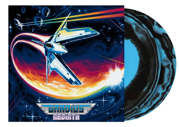 The game’s soundtrack is releasing as a double-vinyl album, pressed on two black and blue vinyl discs. The album comprises 34 tracks of music by Konami Kukeiha Club (Konami’s in-house sound team who also composed the soundtracks to games such as Policenauts and Castlevania: The Adventure ReBirth). The music in Gradius ReBirth features updated ‘remixes’ of the original Gradius score.